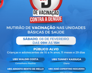 Neste sábado, 8 de fevereiro, das 9h às 15h, teremos um mutirão de vacinação contra a dengue. A vacinação será exclusiva para crianças e adolescentes de 10 a 14 anos, 11 meses e 29 dias. Importante ressaltar que somente a vacina contra a dengue será aplicada neste dia.