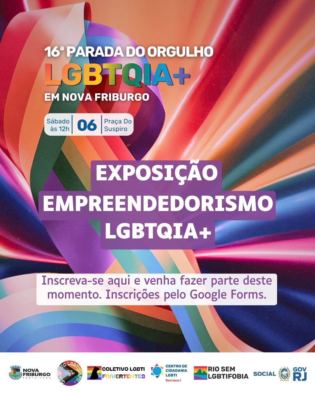 A Prefeitura de Nova Friburgo, por meio do Centro de Cidadania LGBTI Serrana I-Hanna Suzart, em parceria com o Programa Rio Sem LGBTIfobia e movimentos sociais – Coletivo LGBTI FRIVERTENTES e COLETIVO LGBTQIAPN+ – anuncia a realização da 16ª Parada do Orgulho LGBTQIA+ de Nova Friburgo.