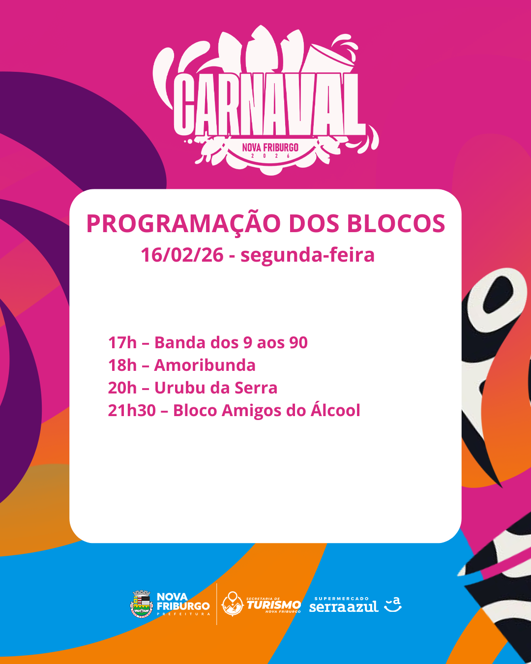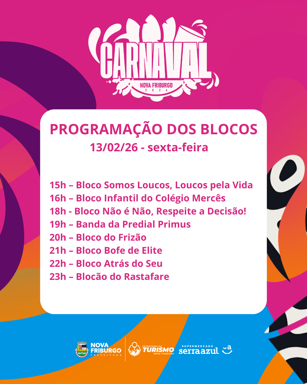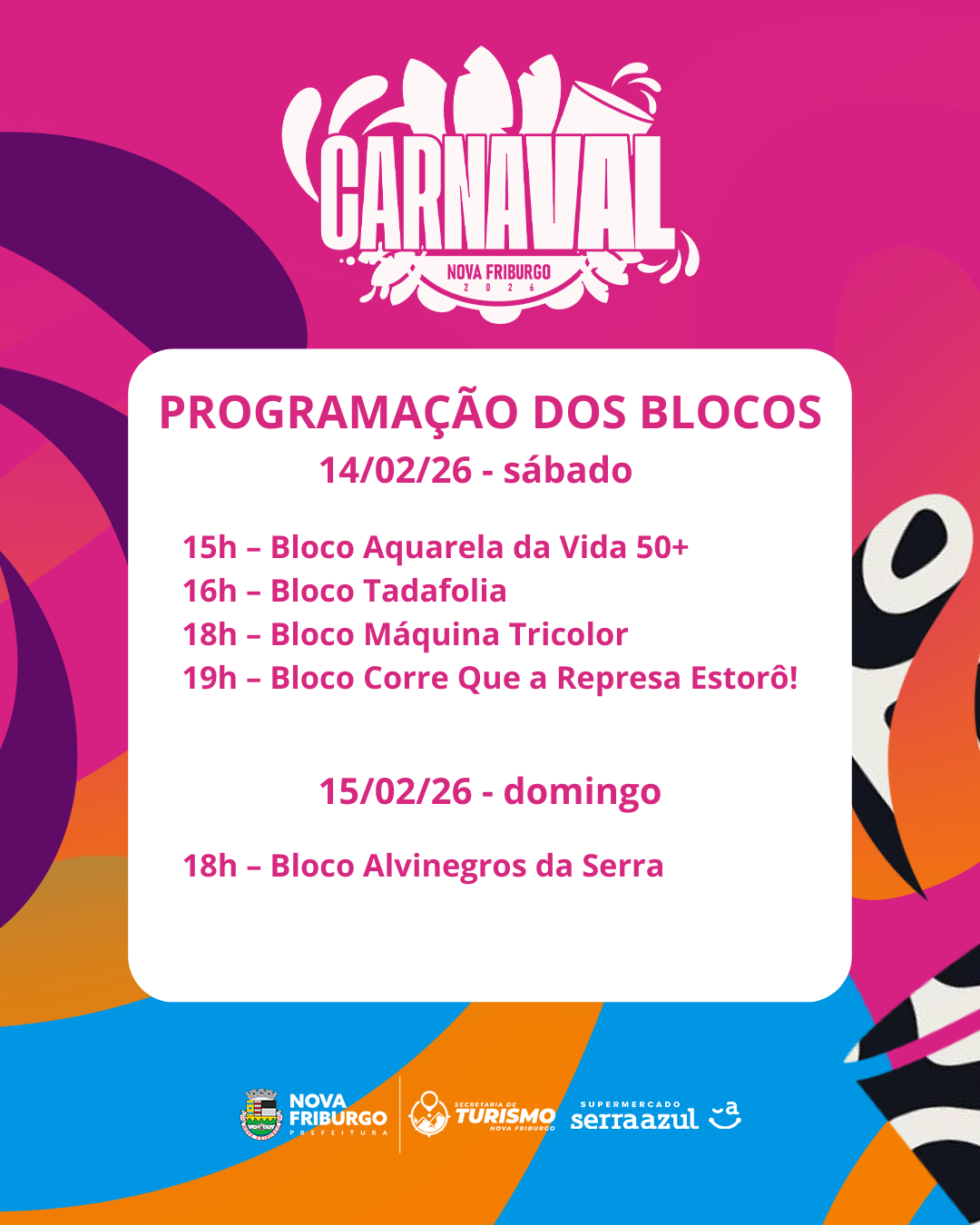 Além do brilho na avenida, o Carnaval de Nova Friburgo também ganha a Alberto Braune com a energia contagiante dos blocos, reunindo foliões de todas as idades em diversos pontos da cidade. Tradição, irreverência, inclusão e muita animação marcam a programação, que promete arrastar multidões e espalhar alegria por todos os cantos.