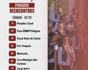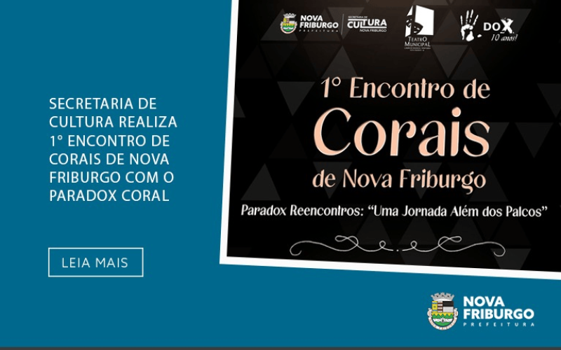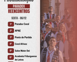 A Prefeitura de Nova Friburgo, por meio da Secretaria de Cultura, irá promover, nos dias 06 e 07 de dezembro, o 1° Encontro de Corais de Nova Friburgo, Paradox Reencontros: “uma jornada além dos palcos”, no Teatro Municipal Laercio Rangel Ventura. O vigor da juventude mesclado à experiência do maestro João Cláudio Daumas Lassarotte pautam e dão a sintonia para este trabalho.
