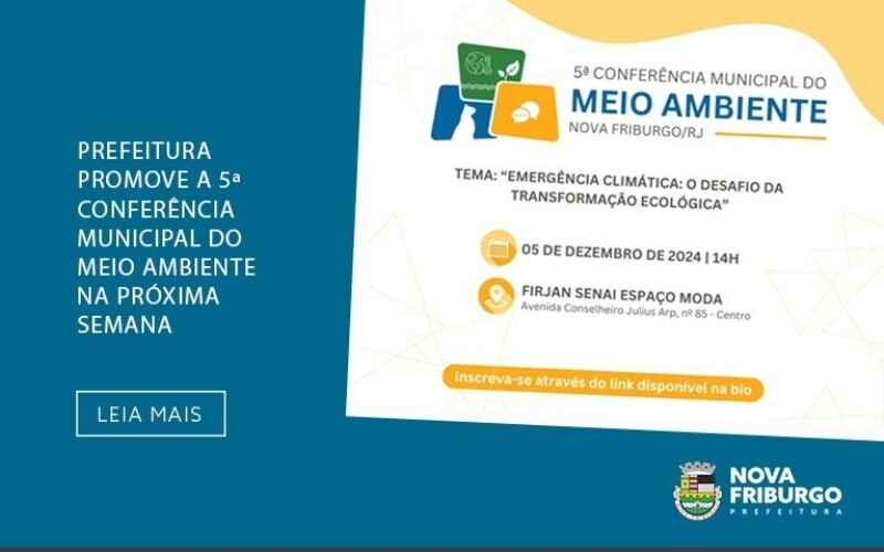 No próximo dia 05 de dezembro, a partir das 14h, na Firjan Senai Espaço Moda, acontecerá a 5ª Conferência Municipal do Meio Ambiente de Nova Friburgo, com o tema “Emergência Climática: o Desafio da Transformação Ecológica”. A realização é da Prefeitura de Nova Friburgo, por meio da Secretaria de Meio Ambiente e Desenvolvimento Urbano Sustentável.