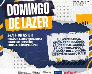 A Prefeitura de Nova Friburgo, por meio da Secretaria Municipal de Esportes, promove mais uma edição do “Domingo de Lazer”, no próximo dia 24, no Ginásio Alberto da Rosa Pinheiro, em Conselheiro Paulino. O evento será realizado das 9h às 13h. Em caso de chuva, será cancelado.
