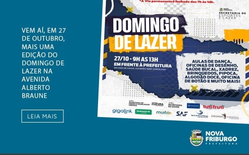 A Prefeitura de Nova Friburgo,por meio da Secretaria Municipal de Esportes, vai promover no domingo, 27 de outubro, mais uma edição do "Domingo de Lazer", na Avenida Alberto Braune, no Centro, em frente a Prefeitura. O evento será realizado das 9h às 13h e o trecho onde ocorrerão as atividades ficará fechado ao trânsito de veículos das 7h às 14h. Em caso de chuva o evento será cancelado.
