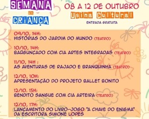 A Secretaria de Cultura de Nova Friburgo, em parceria com o Instituto Energisa e com o apoio da Concessionária Rota 116, apresenta a Semana da Criança, que contará com uma série de espetáculos gratuitos para o público infantil, entre os dias 9 e 12 de outubro, na Usina Cultural Energisa.