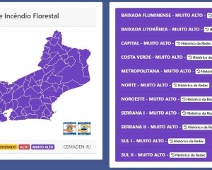 O painel do Centro Nacional de Monitoramento e Alertas de Desastres Naturais (Cemaden-RJ), que surgiu da necessidade de um monitoramento mais efetivo e abrangente, de forma a atender igualitariamente todos os 92 municípios do Estado quanto aos eventos de desastres naturais, alerta para risco MUITO ALTO de incêndios florestais em todas as regiões do Estado do Rio de Janeiro.