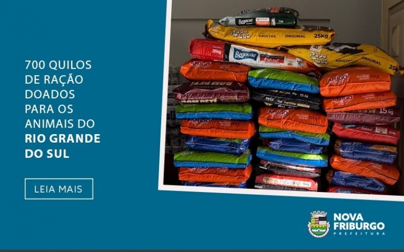 Na tarde desta quinta-feira, 08, a Prefeitura de Nova Friburgo recebeu uma grande doação das empresas Agro Pet Mury, Agro Pet Stucky e Soma Pet Food para ajudar aos animais que também são vítimas das inundações no Rio Grande do Sul. São aproximadamente 700 quilos de ração que serão entre a grupos de protetores e tutores em todo o estado.