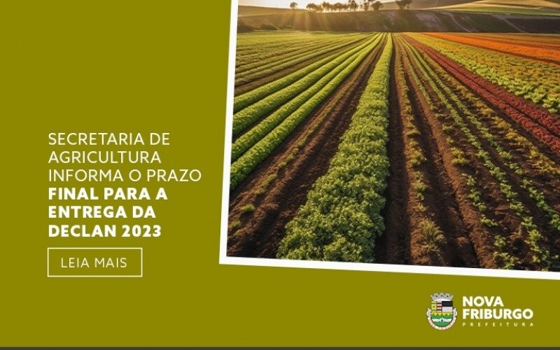 A Secretaria Municipal de Agricultura e Desenvolvimento Rural da Prefeitura de Nova Friburgo reforça junto aos produtores rurais do município que o prazo para entrega da Declaração Anual de Produção Agropecuária do ano de 2023 (Declan 2023) se encerra agora no mês de maio.