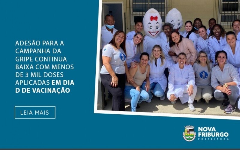 No último sábado, dia 14, foi realizado em Nova Friburgo o Dia D de vacinação contra a gripe e multivacinação para atualização da caderneta vacinal. Todas as unidades básicas de saúde e estratégias de saúde da família que possuem sala de vacinação disponibilizaram os imunizantes. Mas, mesmo assim, a adesão foi baixa.