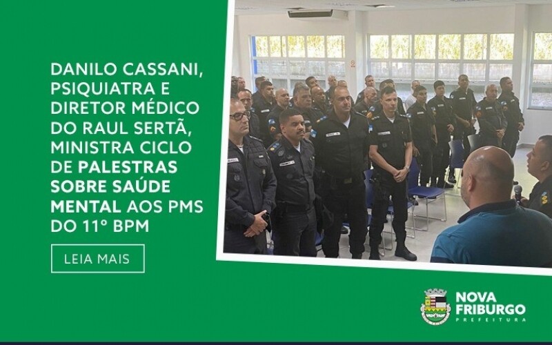 O diretor médico do Hospital Municipal Raul Sertã, Danilo Cassani, que é médico psiquiatra, ministrou na segunda-feira, 1º de abril, o segundo ciclo de palestras para policiais militares do 11º Batalhão de Polícia Militar (BPM), com o tema “saúde mental”. O encontrou ocorreu no auditório do Sest/Senat de Nova Friburgo. Ao todo, 170 policiais militares estiveram presentes às palestras, o que corresponde a todo o efetivo da unidade.