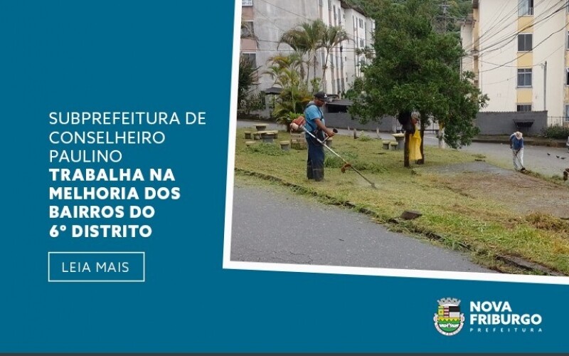 A Prefeitura de Nova Friburgo, através da Subprefeitura de Conselheiro Paulino, está trabalhando na manutenção de diversos logradouros do 6º distrito, conforme as solicitações que chegam ou seguindo o cronograma de ações traçado entre a subprefeita Patrícia Felippe e o prefeito Johnny Maycon. A área de atuação em Conselheiro Paulino é muito grande, porém dia após dia as equipes vão dando conta dos atendimentos.