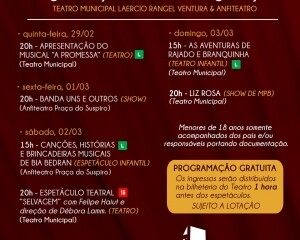Apresentações musicais e teatrais estão previstas entre os dias 29 de fevereiro e 03 de março. Atrações são gratuitas