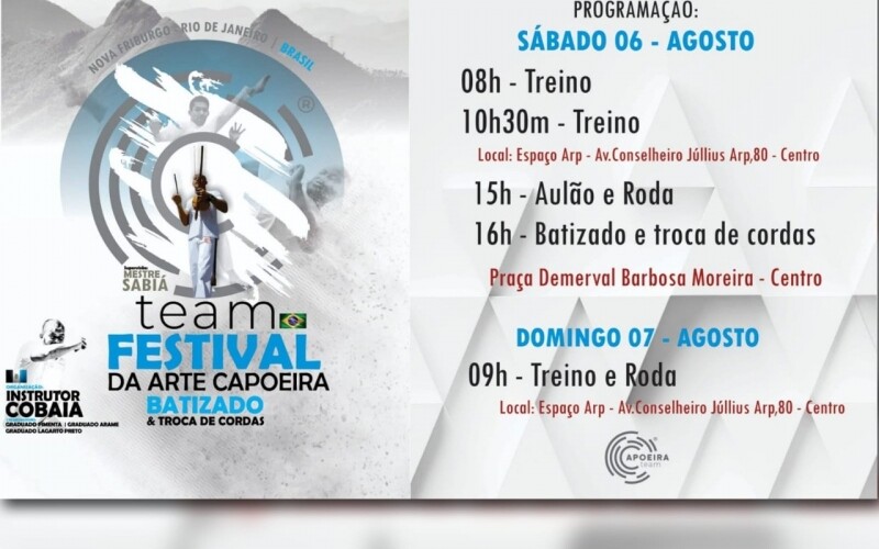 O Festival Capoeira Team 2022 está com a realização programada para o próximo fim semana, dias 6 e 7 de agosto, em dois lugares de Nova Friburgo: ...