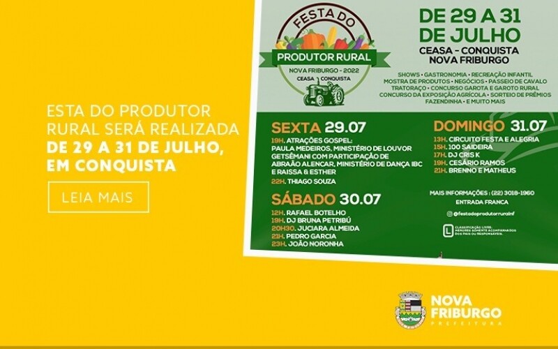 FESTA DO PRODUTOR RURAL SERÁ REALIZADA DE 29 A 31 DE JULHO, EM CONQUISTA Nova Friburgo terá, entre os dias 29 e 31 de julho, a edição 2022 da Fest ...