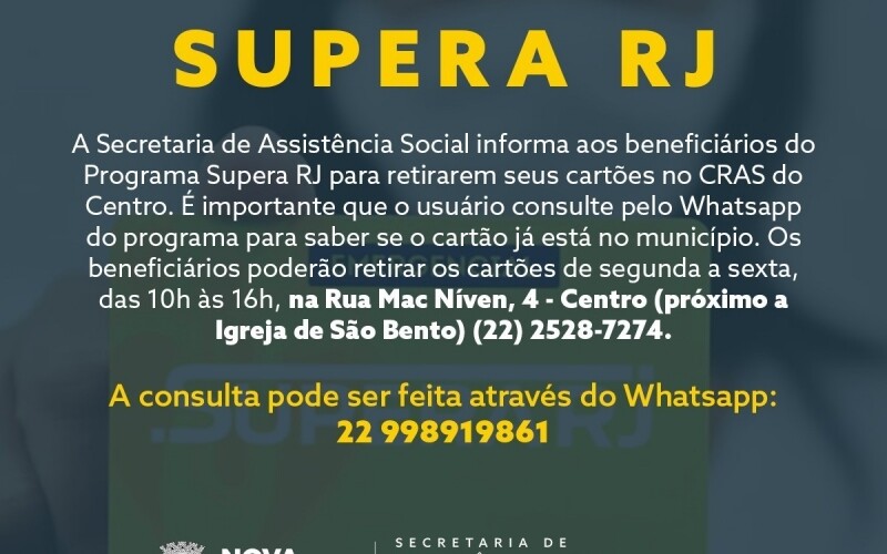A Secretaria de Assistência Social de Nova Friburgo informa que tem dado continuidade a entrega dos cartões do Supera RJ, auxílio emergencial do ...