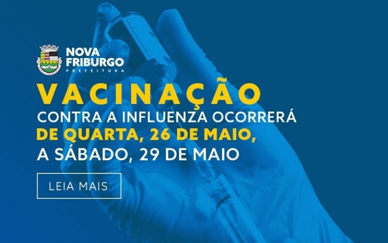 VACINAÇÃO CONTRA A INFLUENZA OCORRERÁ DE QUARTA, 26 DE MAIO, A SÁBADO, 29 DE MAIO; CONFIRA O CRONOGRAMA A Prefeitura de Nova Friburgo, po ...