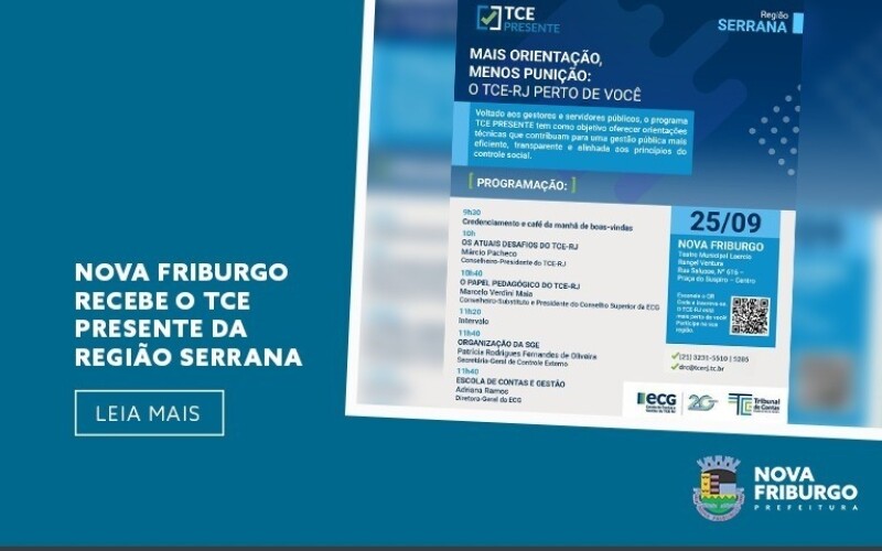 Nova Friburgo será palco da edição regional do “TCE Presente – Mais orientação, menos punição”, no dia 25 de setembro, das 9h30 às 13h, no Teatro ...