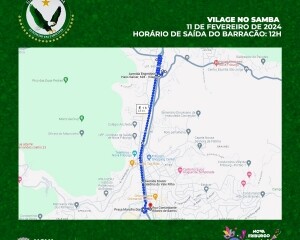 Trajeto: Rua Albertino Quadro Gama (o deslocamento seguirá pelo contrafluxo da via. Haverá interrupção do fluxo de veículos e proibição de estacionamento às 18h do dia 9 de fevereiro de 2024) / Rua Clarindo da Rosa Teixeira (o deslocamento seguirá pelo contrafluxo da via. Haverá proibição de estacionamento e interrupção do fluxo de veículos. O fluxo de veículos com destino ao bairro de Conselheiro Paulino e adjacências será desviado para a Avenida Governador Roberto Silveira) / Avenida Governador Roberto Silveira {sentido Centro} / Avenida Presidente Costa e Silva (o fluxo de veículos com destino ao Centro poderá ser desviado para a Rua Benjamin Constant durante o deslocamento. Ao longo da via, haverá interrupções temporárias nos cruzamentos de acesso à avenida) / Avenida Alberto Santos Dumont / Avenida Doutor Galdino do Vale Filho (haverá interrupção temporária nas vias de acesso à avenida) / Praça Marcílio Dias (o deslocamento seguirá no contrafluxo. Haverá interrupção temporária para a travessia até o ponto de posicionamento) / Rua Comandante Ribeiro de Barros (a via terá proibição de estacionamento no trecho compreendido entre a altura do nº 3 e o nº 17 até o término do evento).