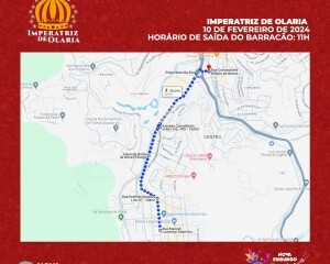 Trajeto: Rua Manoel Lourenço Sobrinho (haverá interrupção de fluxo de veículos e proibição de estacionamento no dia 08 de fevereiro de 2024 após o término da feira) / Rua Prefeito Gustavo Lira (haverá interrupção do fluxo de veículos e proibição de estacionamento a partir da altura do nº 89) / Avenida Júlio Antônio Thurler (haverá interrupção temporária ao longo de todo o trecho para o deslocamento) / Alameda Barão de Nova Friburgo (o deslocamento seguirá pelo contrafluxo da Alameda Barão de Nova Friburgo {sentido Olaria} e o trânsito de veículos será desviado para a Rua Jardel Hottz para acesso à Avenida José Pires Barroso {Via Expressa}) / Avenida Conselheiro Julius Arp (o deslocamento seguirá pelo contrafluxo até a Praça Marcílio Dias. Durante o percurso a via sentido Centro terá implantação de duplo sentido de circulação. O trecho compreendido entre a altura do Acesso 1 do Espaço Arp até o nº 6 da Avenida Conselheiro Julius Arp terá proibição de estacionamento na data do deslocamento) / Praça Marcílio Dias (o deslocamento seguirá no contrafluxo. Haverá interrupção temporária para a travessia até o ponto de posicionamento) / Rua Comandante Ribeiro de Barros (a via terá proibição de estacionamento no trecho compreendido entre a altura do nº 3 e o nº 17 até o término do evento).
