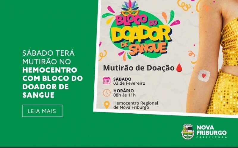 O Hemocentro Regional de Nova Friburgo realizará no próximo sábado, dia 03/02, um mutirão de doação de sangue, das 8h às 11h. A ação busca atender às pessoas que não conseguem ir ao Hemocentro durante a semana para doar. Além disso, neste período carnavalesco, a demanda por sangue aumenta, e sua contribuição pode fazer toda a diferença! Ao doar, você não apenas reforça nossos estoques, mas também proporciona esperança e vitalidade para aqueles que mais precisam.