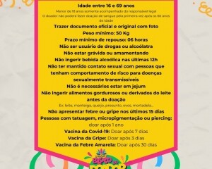 A doação de sangue é um processo rápido e indolor. Para doar, é necessário ter entre 16 e 69 anos de idade, apresentar um documento oficial com foto, pesar mais de 50Kg e não é preciso estar em jejum, basta evitar alimentos gordurosos ou derivados de leite antes da doação.