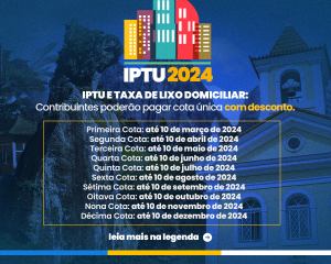 Os contribuintes que estavam com o IPTU e TCLD em dia até o dia 31 de dezembro de 2023 e decidirem pagar em cota única, terão o desconto de 10% no pagamento até o dia 10 de março de 2024. Para os contribuintes que NÃO estavam em dia com o IPTU e Taxa de Coleta de Lixo Domiciliar até o dia 31 de dezembro de 2023, o desconto para pagamento em cota única será de 2%. Já o contribuinte que optar pelo parcelamento, terá a opção do pagamento em 10 cotas, sem desconto, conforme as datas disponíveis.