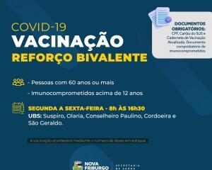 O reforço da vacina bivalente contra a covid-19 foi iniciado nesta segunda-feira, 11, em Nova Friburgo, para pessoas com 60 anos ou mais e imunocomprometidos acima dos 12 anos. A Secretaria Municipal de Saúde segue as orientações técnicas dos governos estadual e federal visando oferecer proteção para a população e combate ao vírus.