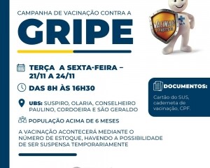 A Secretaria Municipal de Saúde continuará com a vacinação contra a gripe em Nova Friburgo na próxima semana, de terça a sexta-feira, por conta do feriado da segunda, 20, Dia da Consciência Negra. A imunização está disponível para todos acima dos 6 meses de vida e é muito importante no combate a influenza.