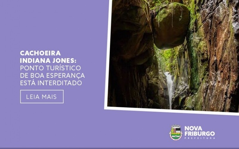 A Prefeitura de Nova Friburgo, por meio da Secretaria de Defesa Civil e sua Superintendência de Operações, interditou o acesso de banhistas à conhecida Cachoeira Indiana Jones, em Boa Esperança, no distrito de Lumiar. A interdição está em vigor desde o mês de junho passado, tendo a área sido bloqueada pelo proprietário após ser notificado. E como a frequência de turistas na região aumenta por ocasião do calor, a Secretaria Municipal de Turismo está comunicando a interdição, além de alertar aos frequentadores que procurem outros locais para banhos de rios e cachoeiras.