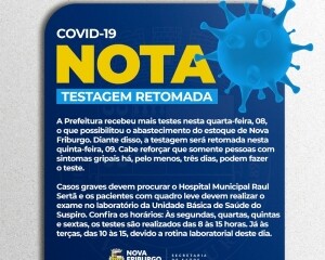 A Prefeitura de Nova Friburgo recebeu mais testes rápidos de covid-19 nesta quarta-feira, 8, o que possibilitou o abastecimento do estoque. Diante disso, a testagem será retomada nesta quinta-feira, 9. Cabe reforçar que somente pessoas com sintomas gripais há, pelo menos, três dias, podem fazer o teste.