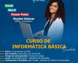 Informática Básica: Excel, Word, Power Point, Noções Básicas de Web e Computador - 21/02/2024 (quarta-feira, 14h às 16h), no Laboratório de Informática da Estácio Friburgo. O curso terá duração de 6 meses (21 aulas), com o professor Igor Arnaldo, bacharel em Ciência da Computação.
