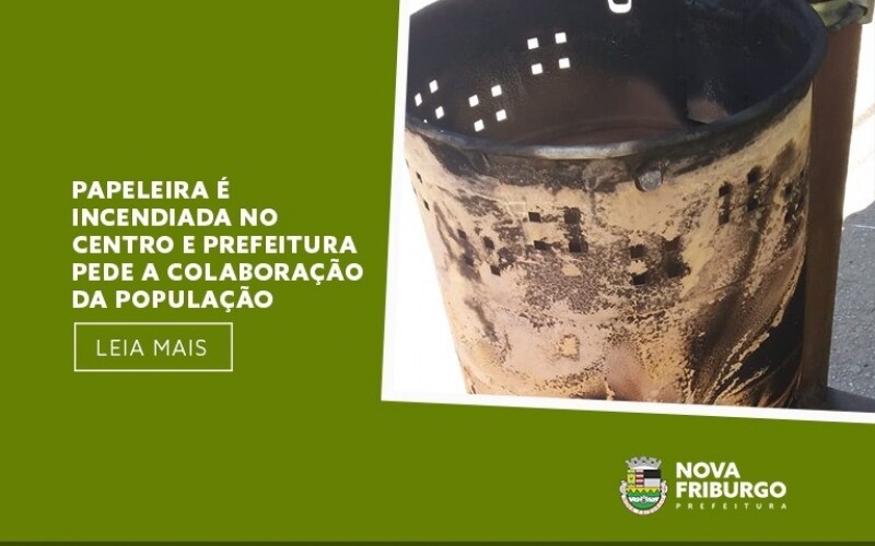 A Prefeitura de Nova Friburgo, através da Secretaria de Serviços Públicos, segue reforçando junto à população a importância de zelar pelo bem público. Neste final de semana, uma das papeleiras de metal fixadas no centro da cidade, na Avenida Euterpe Friburguense, foi alvo de vandalismo, tendo sido incendiada. Para que episódios como este não aconteçam nas papeleiras, acidentalmente, é importante que a população apague a guimba de cigarro antes do descarte.