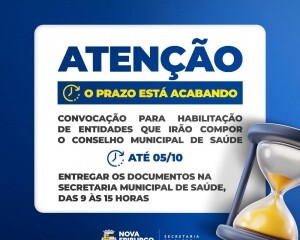 O prazo para a entrega da documentação para habilitação das entidades que irão compor o novo Conselho Municipal de Saúde de Nova Friburgo acaba nesta quarta-feira, 5. Os documentos devem ser entregues das 9h às 15h, na Avenida Alberto Braune, 224, segundo andar, sala 221.
