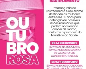 Entre os dias 2 e 6 de outubro serão disponibilizadas 80 vagas na Unidade Básica de Saúde (UBS) de Olaria, 80 na UBS do Suspiro e 80 na UBS de Conselheiro Paulino. Entre os dias 9 e 11 de outubro, serão disponibilizadas 80 mamografias para a UBS do Cordoeira e 80 para a UBS de São Geraldo. E entre os dias 16 e 20 e entre 23 e 27 de outubro, cada Estratégia da Saúde da Família terá cinco vagas disponíveis.