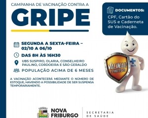 A vacina contra a gripe está sendo oferecida de segunda a sexta-feira, para todos acima dos seis meses, das 8 às 16:30, nas Unidades Básicas de Saúde do Suspiro, Olaria, Conselheiro Paulino, Cordoeira e São Geraldo. É fácil e rápido, só precisa ter em mãos o CPF, cartão do SUS e a caderneta vacinal.