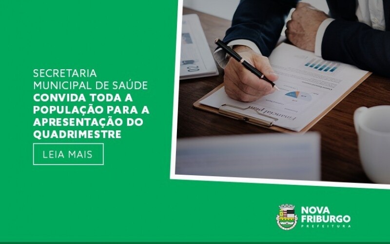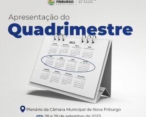 A Secretaria Municipal de Saúde da Prefeitura de Nova Friburgo convida a população para a audiência pública de apresentação do quadrimestre referente aos meses de maio, junho, julho e agosto de 2023, nesta quinta-feira, 28, e sexta, 29, a partir das 9h, no Plenário da Câmara Municipal de Nova Friburgo.