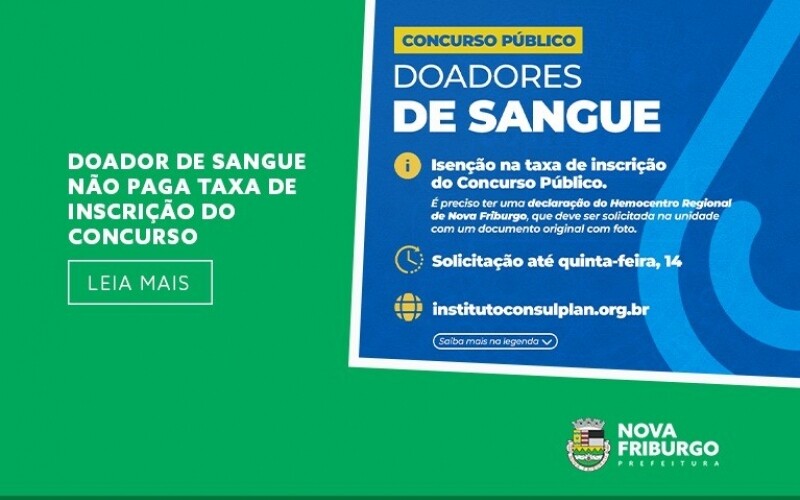 A Prefeitura abriu nesta terça-feira, 12, a inscrição para a realização da prova do concurso municipal de Nova Friburgo. Os doadores de sangue, que realizaram a doação pelo menos duas vezes antes do edital em um prazo de um ano, estão isentos da taxa que deve ser paga no ato do cadastro.