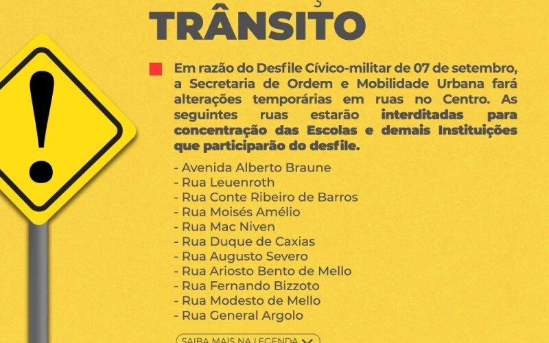 Em razão do Desfile Cívico-militar de 07 de setembro, a Secretaria de Ordem e Mobilidade Urbana fará alterações temporárias em ruas no Centro. No período entre as 22h da quarta-feira, dia 06, até as 14h da quinta-feira, dia 07 de setembro, as seguintes ruas estarão interditadas para concentração das Escolas e demais Instituições que participarão do desfile:
