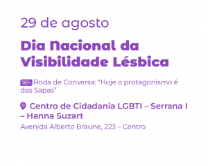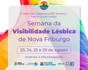 Nos dias 23, 24, 25 e 29 de agosto o Centro de Cidadania Serrana I – Hanna Suzart terá extensa programação na Semana da Visibilidade Lésbica de Nova Friburgo 2023, que será realizada em celebração ao Dia Nacional da Visibilidade Lésbica. O evento contará com palestras, exibições de filmes, roda de conversas e apresentações musicais das chamadas “Lesbianas Futuristas”.