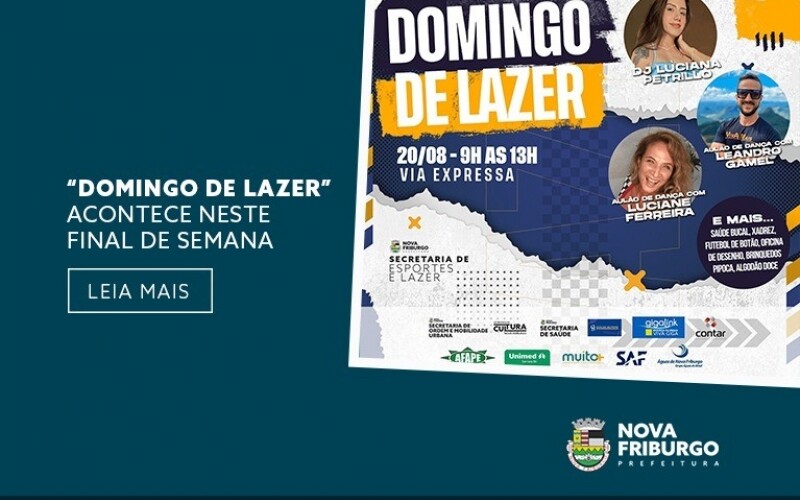 No próximo domingo, dia 20, das 9h às 13h, acontecerá na Via Expressa, em Olaria, a edição de agosto do “Domingo de Lazer”, evento realizado pela Prefeitura de Nova Friburgo, através da Secretaria Municipal de Esportes e Lazer. Lembrando que todas as atrações são gratuitas, abertas para o público em geral.