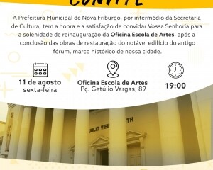 Um dos projetos culturais mais importantes de Nova Friburgo está com a casa nova. Após a conclusão das obras de restauração, a Prefeitura de Nova Friburgo, por meio da Secretaria Municipal de Cultura, reinaugura a Oficina Escola de Artes na próxima sexta-feira, 11 de agosto, às 19h.