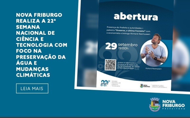 A Prefeitura de Nova Friburgo, por meio da Secretaria de Ciência, Tecnologia, Inovação e Desenvolvimento Econômico, promove a 22ª edição da Semana Nacional de Ciência e Tecnologia (SNCT) no município, que neste ano traz o tema “Planeta Água: Cultura oceânica para enfrentar as mudanças climáticas no meu território”.