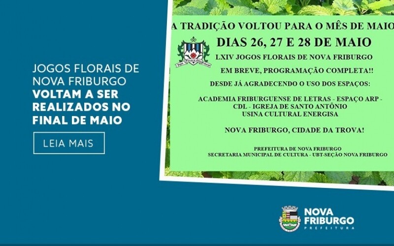 A tradição voltou para o mês de maio. Nos dias 26, 27 e 28 serão realizados os LXIV Jogos Florais de Nova Friburgo. As atividades ocuparão diversos espaços da cidade, como a Academia Friburguense de Letras, Espaço Arp, Câmara de Dirigentes Lojistas (CDL), Capela Santo Antônio e a Usina Cultural Energisa.