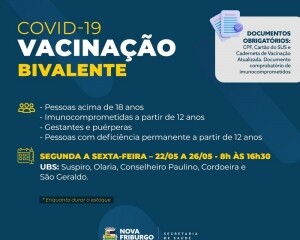 A Secretaria Municipal de Saúde está oferecendo a vacinação contra a covid-19 para toda a população de Nova Friburgo. O imunizante da bivalente, que é o mais atualizado contra as cepas do vírus, está disponível para todos com mais de 18 anos, conforme orienta os órgãos federais e estaduais.