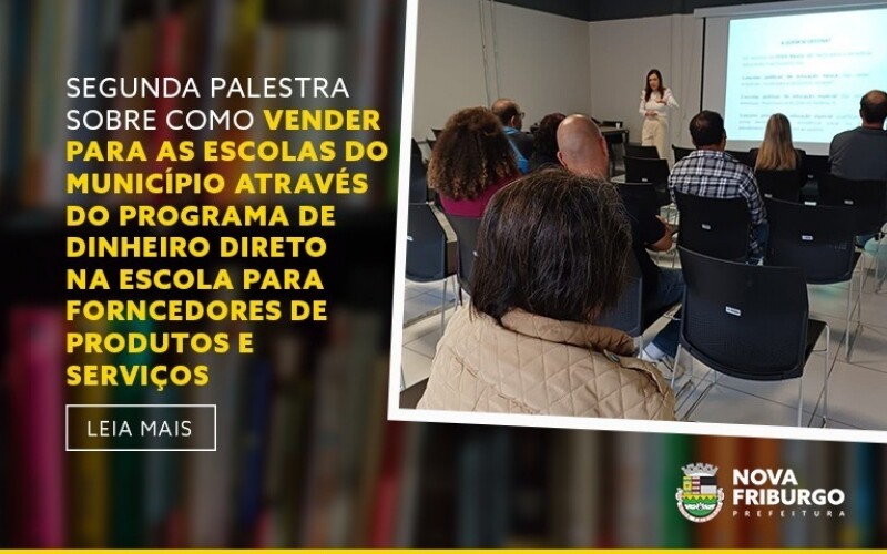Na tarde da última quarta-feira, 17, a Prefeitura, através da Coordenação de Prestação de Contas da Secretaria Municipal de Educação, e o Serviço Brasileiro de Apoio às Micro e Pequenas Empresas de Nova Friburgo (SEBRAE-NF) realizaram a segunda palestra sobre como vender para as escolas do município através do Programa Dinheiro Direto na Escola (PDDE). O evento foi ministrado pela Consultora do SEBRAE Nova Friburgo, Necisia Aguiar e contou com a participação do coordenador de Prestação de Contas da Secretaria Municipal de Educação, Maylon Adame, e da técnica de Prestação de Contas da Secretaria Municipal de Educação, Silvia Werneck.