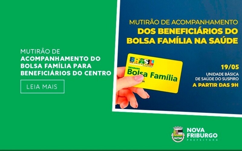 Na próxima sexta-feira, 19, mais um mutirão de acompanhamento dos beneficiários do Bolsa Família será realizado em Nova Friburgo, pela Secretaria Municipal de Saúde. Dessa vez, a ação acontece para os moradores do Centro, na Unidade Básica de Saúde do Suspiro, a partir das 9 horas.