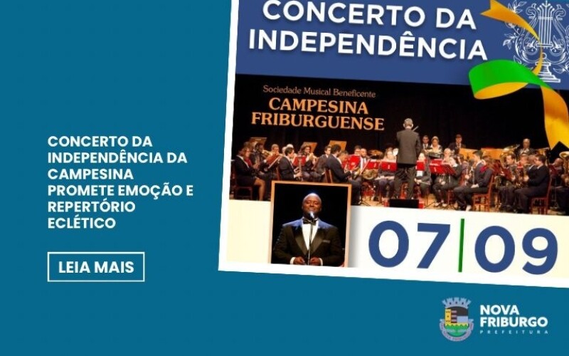 A Sociedade Musical Beneficente Campesina Friburguense, Patrimônio Histórico e Cultural do Estado do Rio de Janeiro e considerada de Utilidade Pública Municipal, Estadual e Federal, anuncia a realização de mais uma edição do tradicional Concerto da Independência do Brasil. A edição deste ano acontece no domingo, dia 7 de setembro, às 19h, no Teatro Municipal Laercio Rangel Ventura, que fica na Praça do Suspiro. A entrada é franca, mediante retirada de ingressos na bilheteria uma hora antes do concerto.