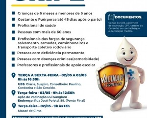 A campanha acontece de terça a sexta-feira, excepcionalmente, por conta do feriado do Dia do Trabalhador, em 1º de maio, nas Unidades Básicas de Saúde do Suspiro, Olaria, Conselheiro Paulino, Cordoeira e São Geraldo.
