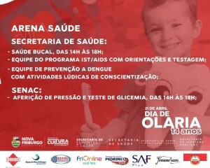 A Secretaria Municipal de Saúde estará presente com serviços de assistência à população. Das 14h às 18h as equipes da saúde bucal estarão realizando atividades lúdicas com as crianças, tecendo informações para todas as idades e distribuindo kits de higiene com escova de dente, creme dental e fio dental.