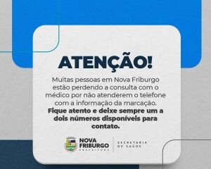 A Secretaria Municipal de Saúde de Nova Friburgo alerta a população sobre as ligações para marcação de consultas no SUS, principalmente as que estão na fila do sistema de regulação. Infelizmente, muitas pessoas estão perdendo o dia de atendimento por não atenderem o telefone, mesmo quando há a insistência de telefonemas por parte das equipes.