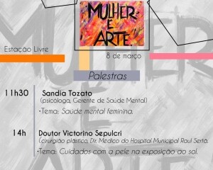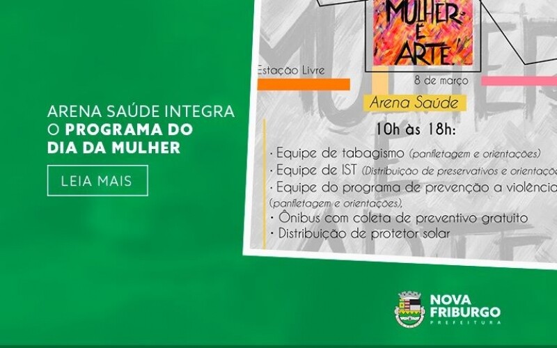 Na próxima quarta-feira, 8, em celebração ao Dia da Mulher, a Prefeitura de Nova Friburgo, por meio da Secretaria Municipal de Cultura, realizará o evento ‘’Mulher é Arte’’, na Estação Livre. E a Secretaria Municipal de Saúde terá um espaço para assistência chamado ‘’Arena Saúde".